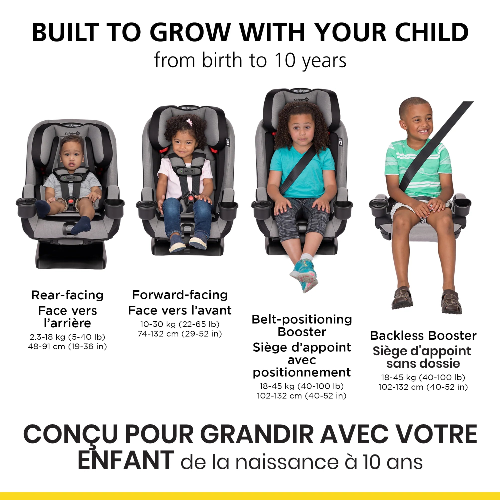 - GROWS WITH YOUR CHILD 4 modes of use accommodate children from birth to age 10: rear-facing (5–40 lbs.), forward-facing (22–65 lbs.), belt-positioning booster (40–100 lbs.), and backless booster (40–100 lbs.). Converts to backless booster with one hand.