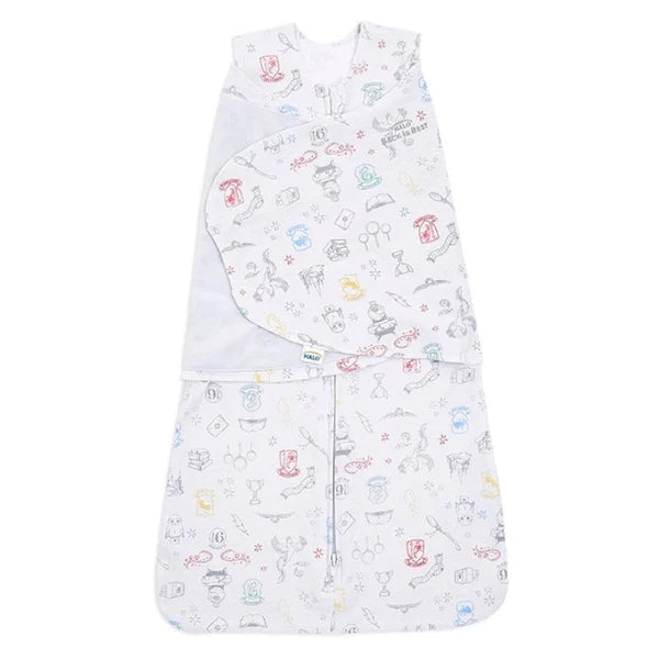 This Harry Potter™ x HALO® SleepSack® Swaddle combines the magic of Harry Potter™'s adventures with the magic of a restful night of sleep. Explore our two exclusive, enchanting prints to find which best speaks to your little witch or wizard. The Harry Potter swaddle helps to prevent the startle reflex, so your baby sleeps more soundly, no spells required! And adjustable velcro swaddle fasteners make it easy to swaddle wrap your baby three ways; arms in, hands-to-face, or with one or both arms out.