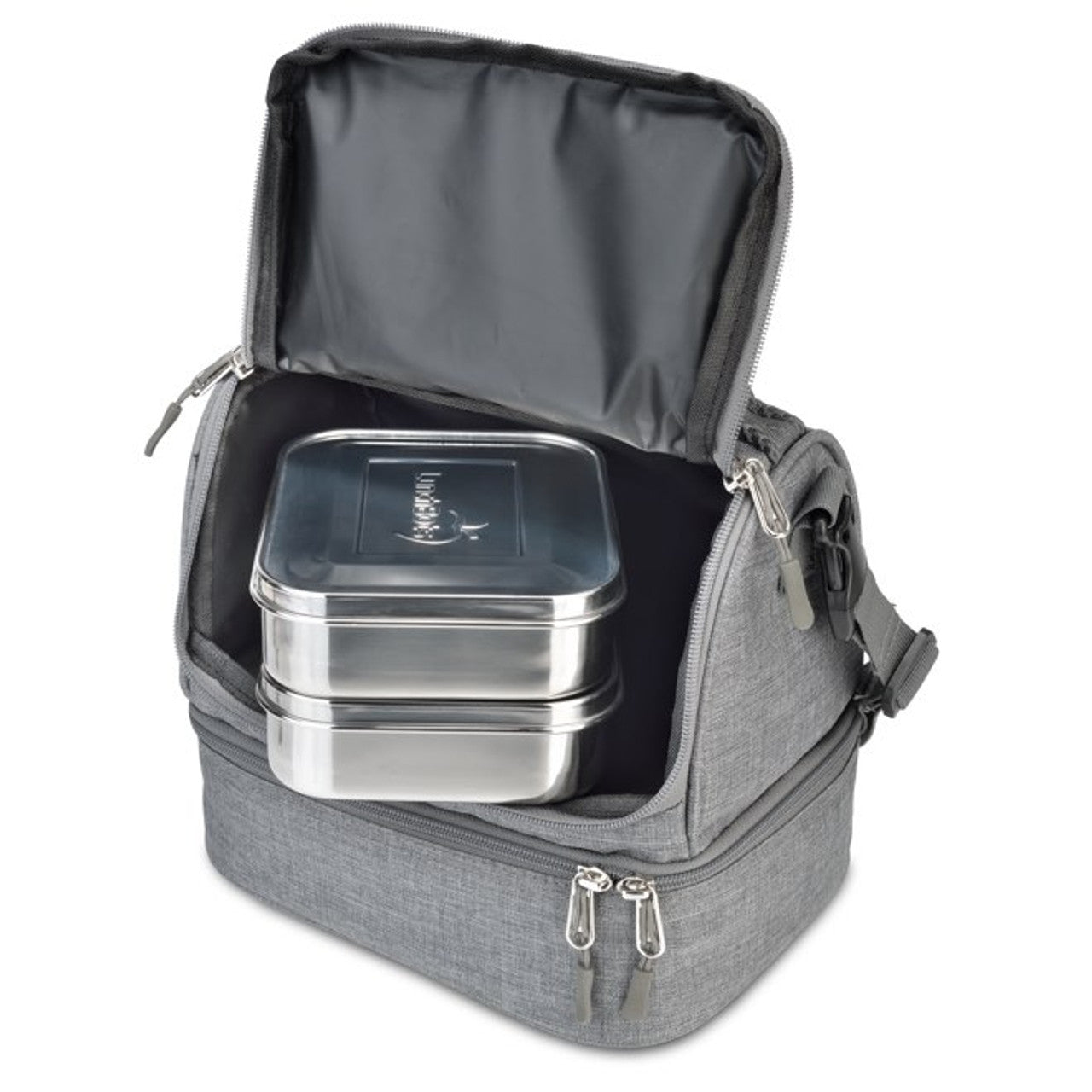 The insulated Duplex Bag keeps your bento boxes as neat as the food inside them. Two separate zippered sections: The bottom is sized perfectly for one LunchBots large container to lie flat. The top holds a Thermal container, water bottle, and an apple. Carry by hand or use the extendable shoulder strap.
