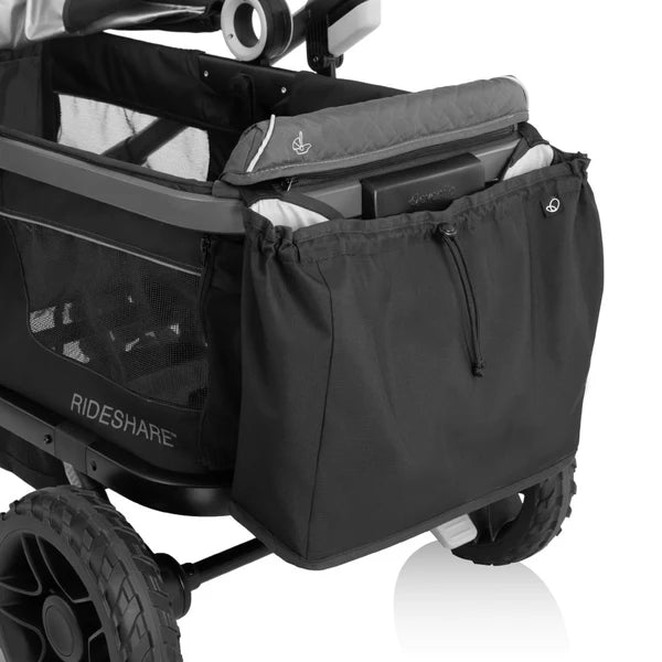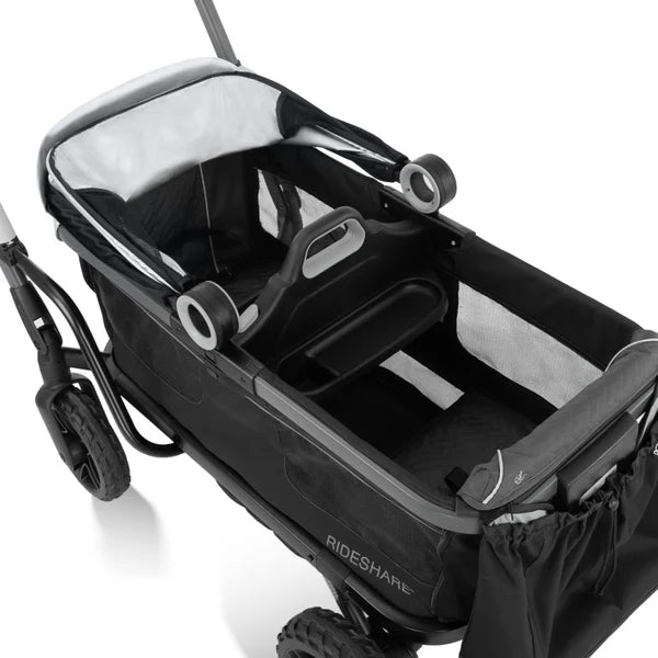 Range far from the everyday with the rugged-meets-refined Evenflo® Shyft™ Rideshare™ All-Terrain Performance Stroller Wagon. Every detail has been engineered for performance, starting with the all-terrain, no-flat urethane wheels and rear suspension to master challenging terrain. Accommodates two children 6 months to 5 years — each seat holds a child up to 55 lb (110 lb total). Features a 3-position telescoping handle to push as a stroller or pull as a wagon, built-in infant car seat attachment, unique cargo mode (not to be used for transporting children), expandable UPF 50+ canopy with visor, and more!