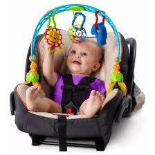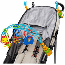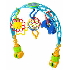 Add this versatile arch to babys stroller and suddenly strolling and shopping becomes an adventure! The Flex n Go Activity Arch from Oball easily attaches to almost any stroller and keeps baby entertained with an easy-to-grasp Oball, a lion rattle, an elephant rattle and Oball Linky Loops to attach additional toys. The flexible, soft material keeps little hands busy with a bold colors and tactile challenges.