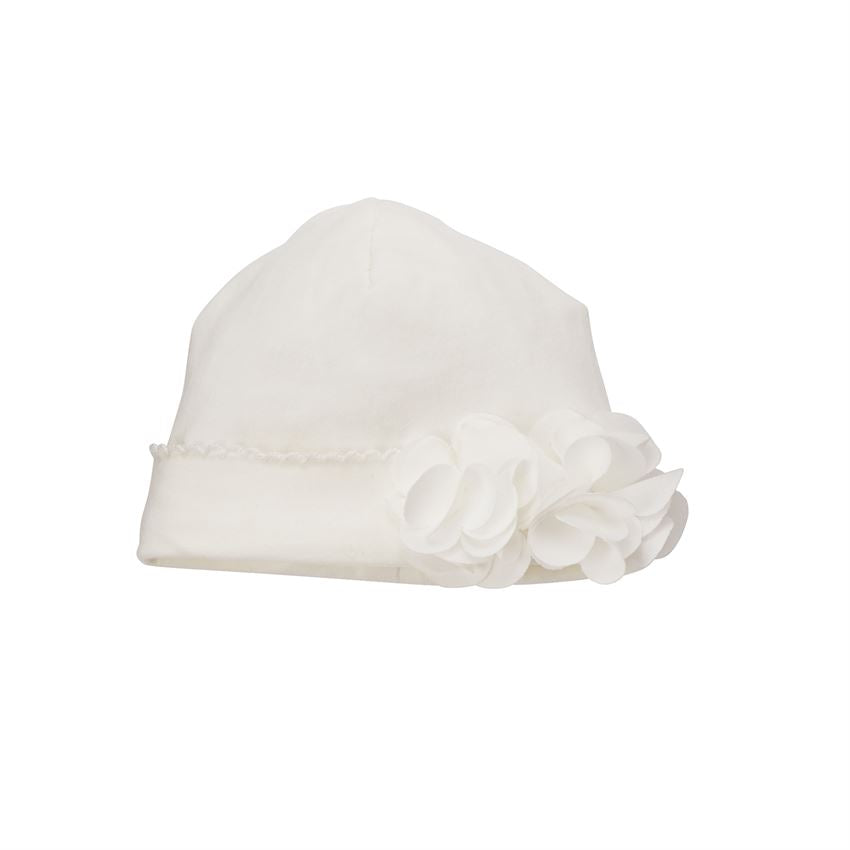 April showers bring May flowers, and this little beauty is in full bloom! This cotton and spandex cap features a dimensional poly chiffon flower detail, and picot stitch accents at the turned brim.