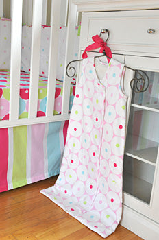 The set includes a simple, classic crib skirt, a perfectly fun, dotted 100% cotton crib sheet and a sleep cozy size 0-3 months with adjustable length.