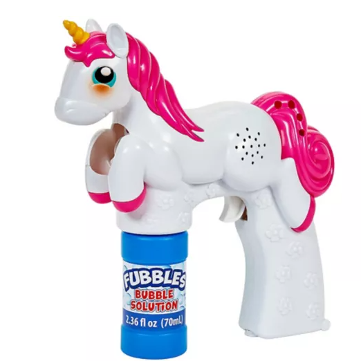 The Fubbles® Musical Bubble Unicorn lights up, plays music and blows bubbles - making it the perfect gift for birthdays and other celebrations! It's simple to use - just screw the bubble solution bottle onto the front of the Bubble Unicorn and then squeeze the trigger! Requires 3 "AA" batteries, not included. Includes 1.52 fl. oz. of bubbles.