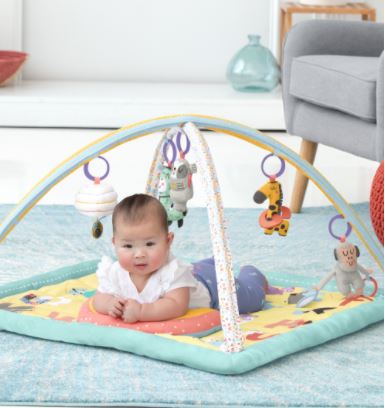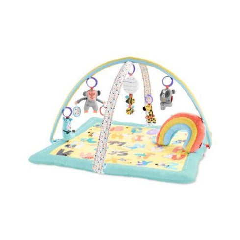Introduce little ones to the alphabet at playtime—from A to Z! An ultra-plush mat with colorful artwork encourages object recognition, while a supportive rainbow pillow is ready for tummy time fun. Five whimsical animal friends engage baby’s senses with music, textures, sounds and more to explore while having fun.