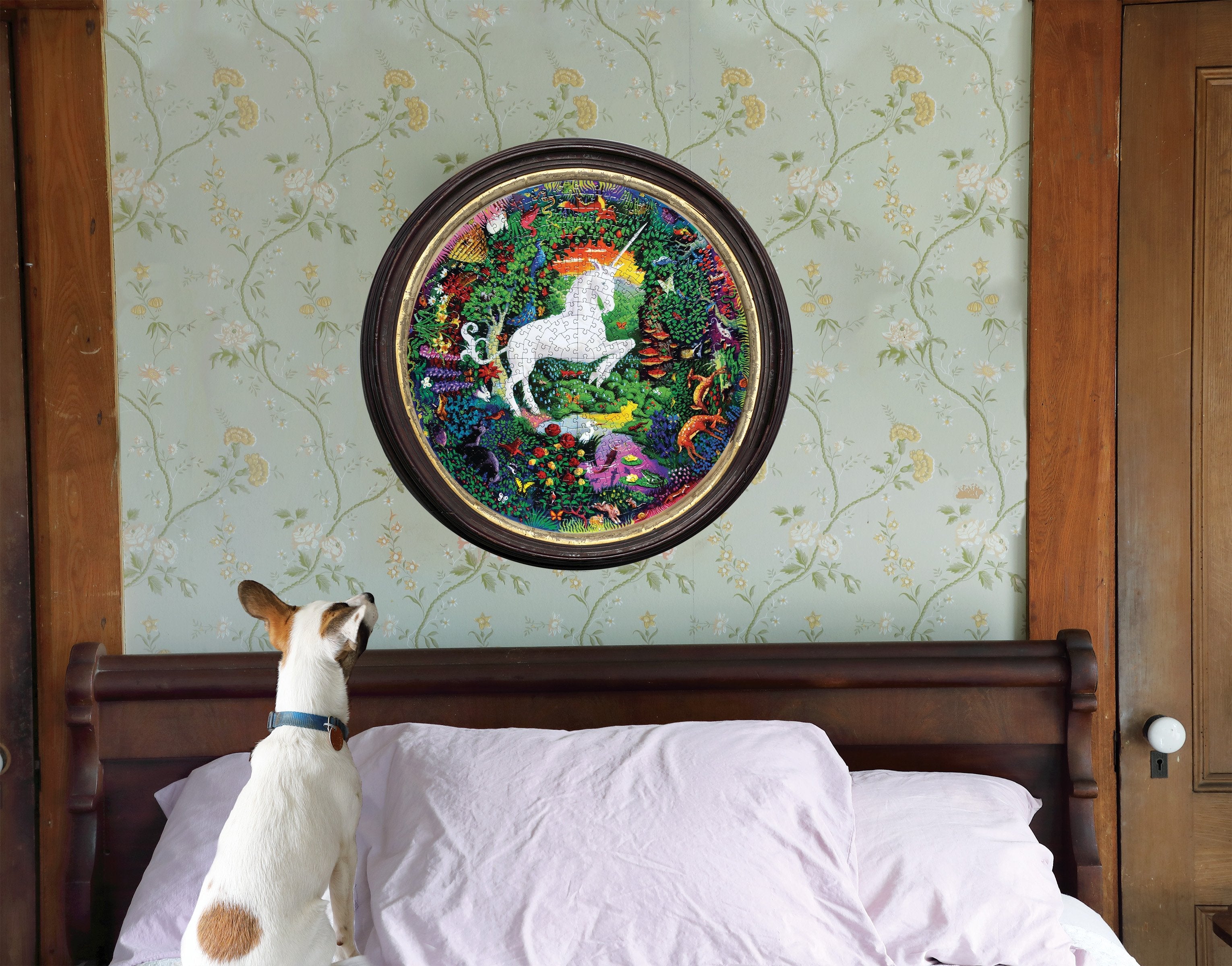 Take on the extra challenge of a round puzzle! This intricately painted scene by illustrator Kevin Hawkes will transport any puzzler into a magical realm. A glowing sunset illuminates the inhabitants of the Unicorn's secret home; can you find the singing peacock or spot a humble hedgehog?