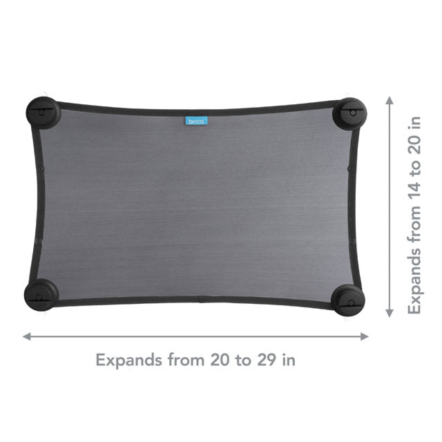 Stay made in the shade with the Brica® Stretch to Fit™ Sun Shade! The Safe-View Mesh blocks glare, not view and helps keep your little ones protected from harmful UV-A/UV-B rays. The new and improved suction cup attachment provides superior grip, making it the best car ride companion. Large windows? This shade stretches to nearly double the size! Excess fabric? The snap feature tailors the shade to any window shape and smaller size! Enjoy the ride! Great for use with any passenger - babies, toddlers, kids and adults.