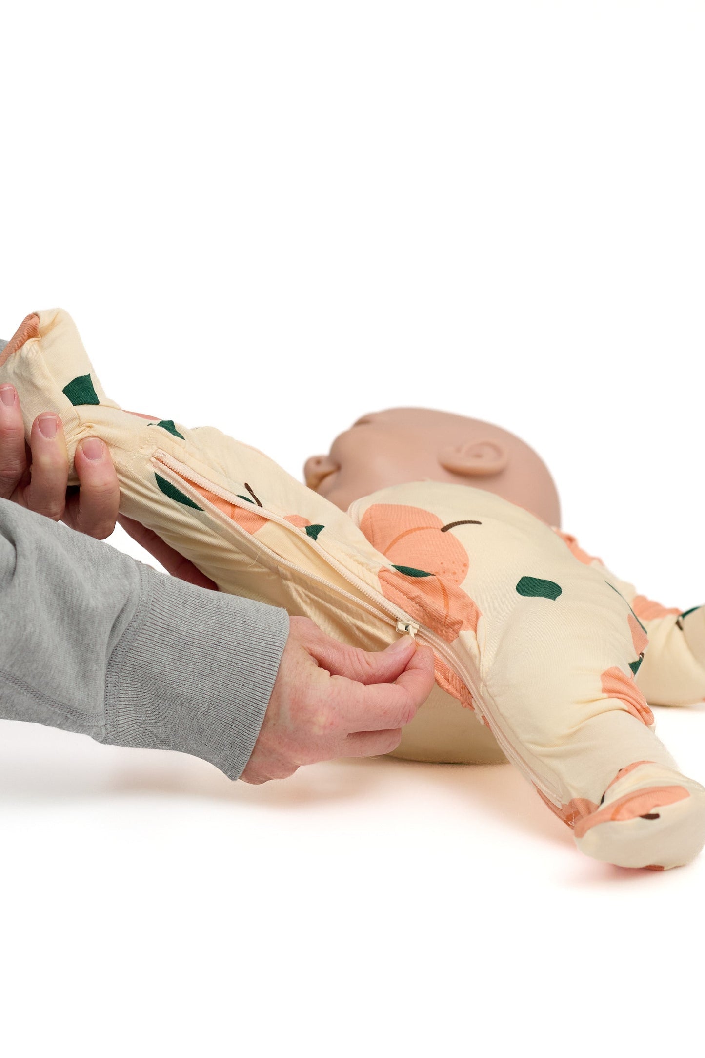 Peachy perfection! Up your diaper changing game with our snap-free two zipper sleeper!